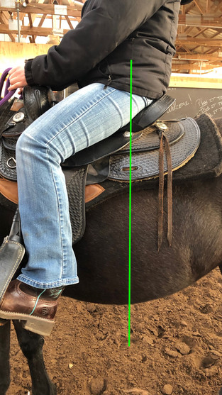 The picture to the right shows an example of a rider with their leg too far back. Because the leg is behind the hip, it rolls the riders seat out of the saddle and and perches them forward. The green arrow shows how the rider's seat is rolled out of the saddle because of this placement of the leg. This leg position can be potentially dangerous because of how the rider is pushed forward over the horse and if the horse were to make a sudden movement the rider would have less stability. It is also harder to get your heels in a down position if your leg is this far back.